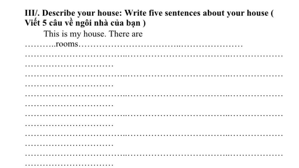 This is my house. There are five rooms in my house : living room, two bedrooms, kitchen, bathroom. My house is surrounded by the white walls and the fences. My house has a garden with a lot of trees and flowers. I love my house.