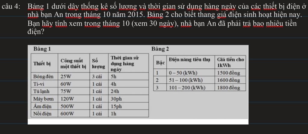 câu 4: Bảng 1 dưới dây thống kê số lượng và thời gian sử dụng hàng ngày của các thiết bị điện ở