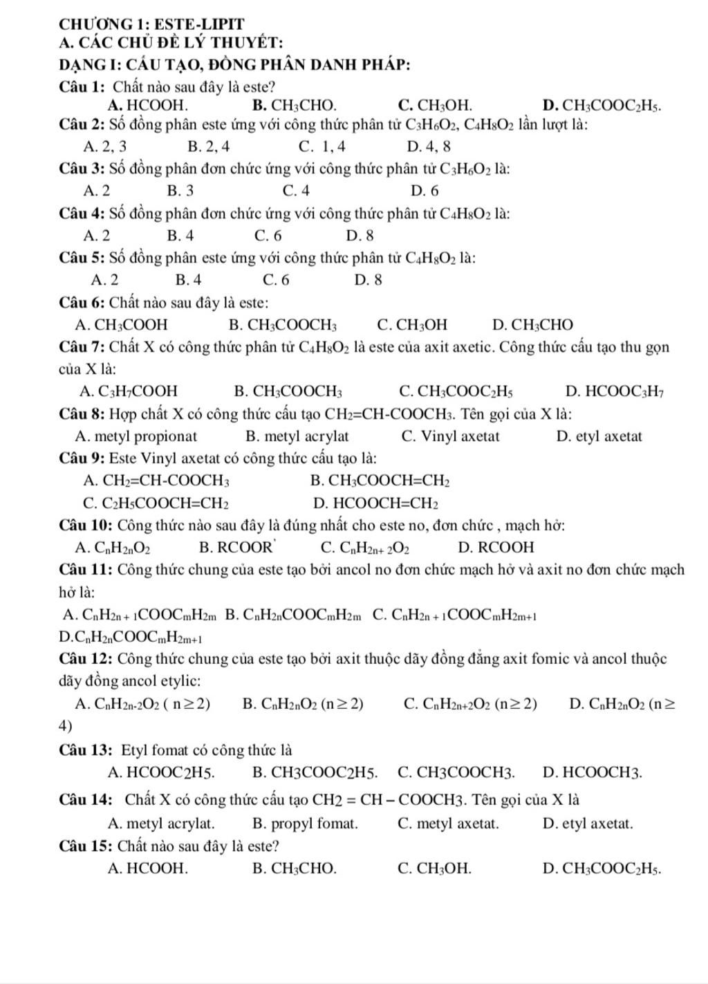Câu 2: Số đồng phân este ứng với công thức phân tử C3H6O2, C4H8O2 lần lượt là: