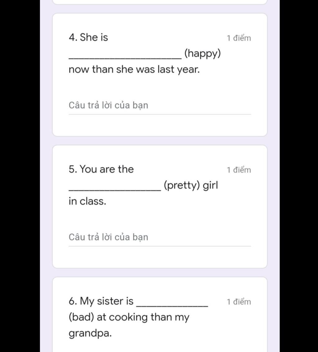 4) She is happier now than she was last year.(Câu sshk tính từ happy có đuôi là y đổi thành i rồi thêm er)