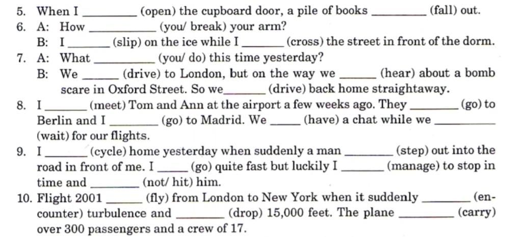 9. I cycled home yesterday when suddenly a man stepped out into the road in front of me . I went quite fast but luckily I managed to stop in time and didn't hit him.
