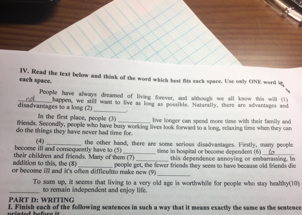 (4) On the other hand, there are some serious disadvantages. Firstly, many people become ill and consequently have to (5) spend time in hospital or become dependent (6) on their children and friends. Many of them (7) find this dependence annoying or embarrassing. In addition to this, the (8) older people get, the fewer friends they seem to have because old friends die or become ill and it's often dicult to make new (9) friends