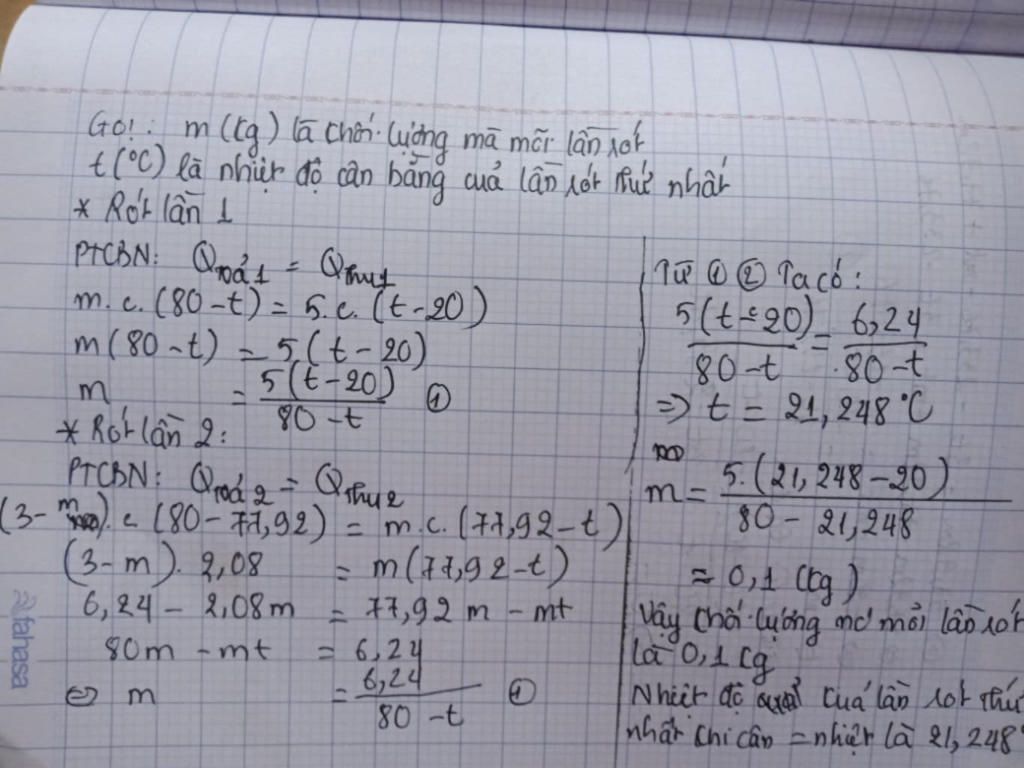 Từ (1) và (2) ta tìm được: t = 68,830C, m ≈0,15 kg
