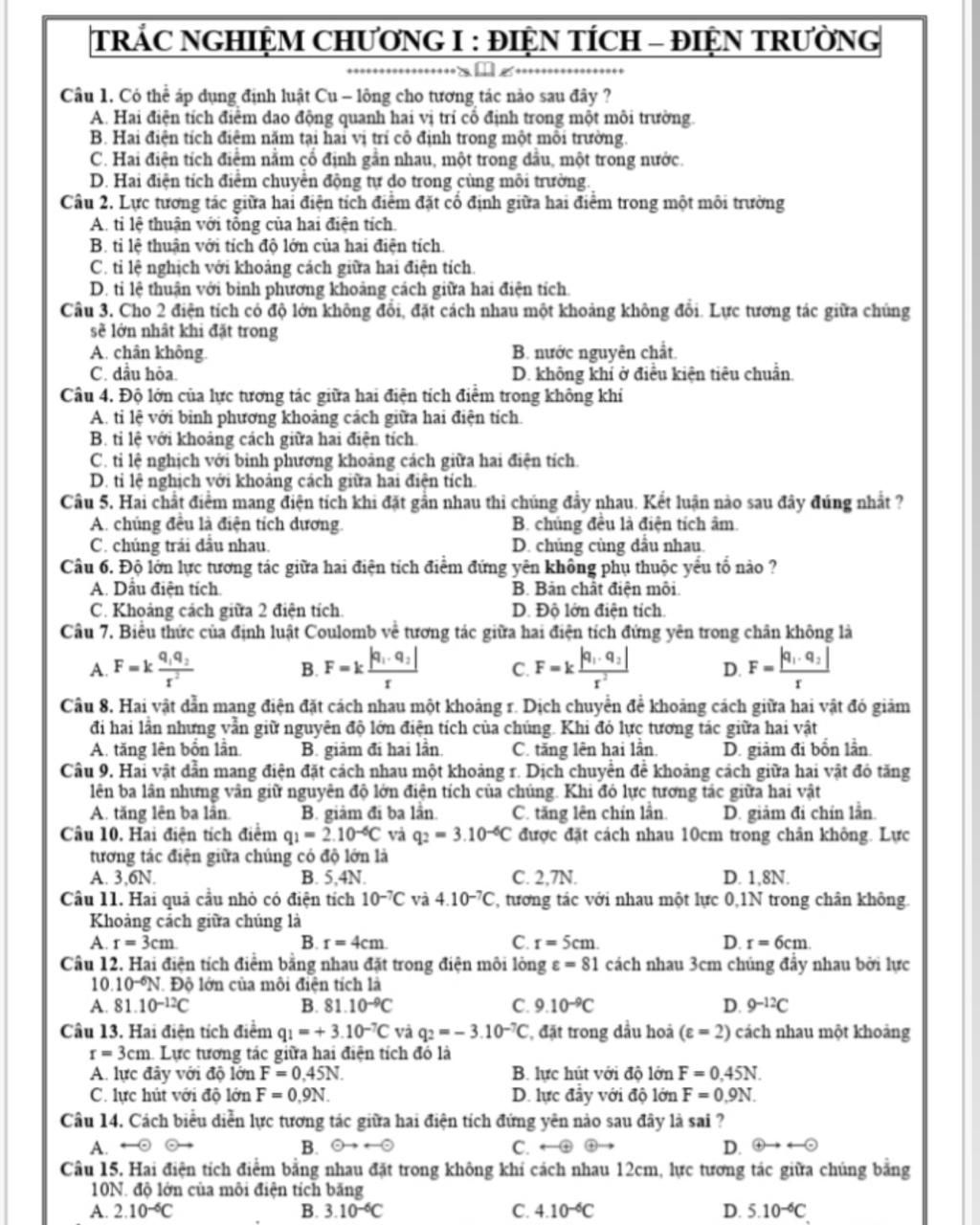 TRẮC NGHIỆM CHƯƠNG I : ĐIỆN TÍCH – ĐIỆN TRƯỜNG