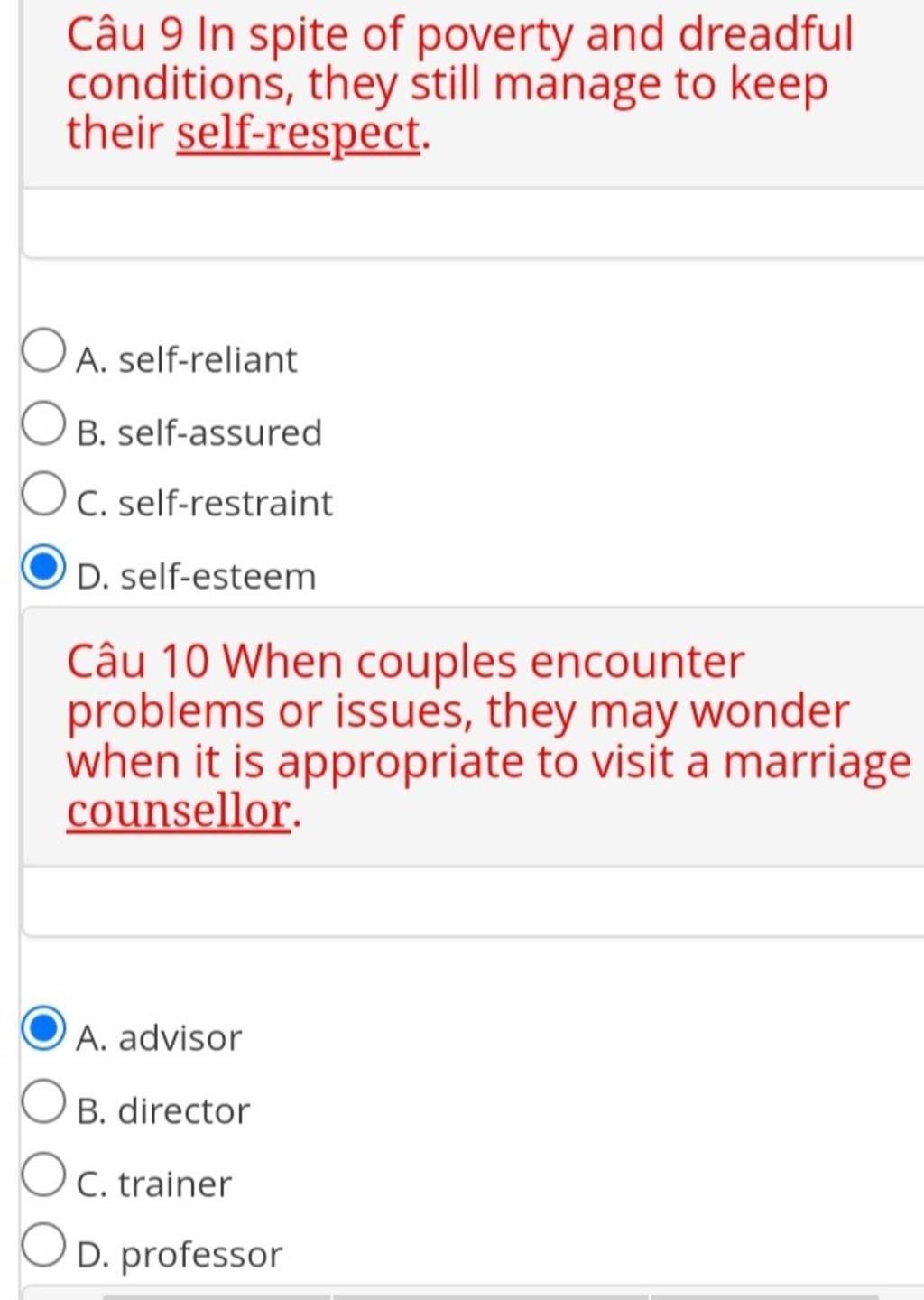 9. D self-respect ~ self-esteem: lòng tự trọng
