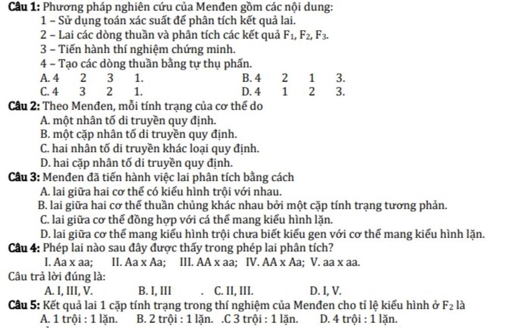 Câu 1: Phương pháp nghiên cứu của Menđen gồm các nội dung: