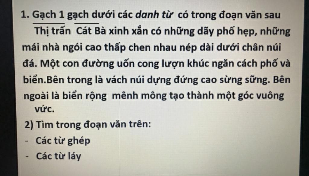 1. Danh từ : Thị trấn , Cát Bà , dãy phố , mái nhà , ngói , chân núi đá , đường , biển , phố, vách núi ,
