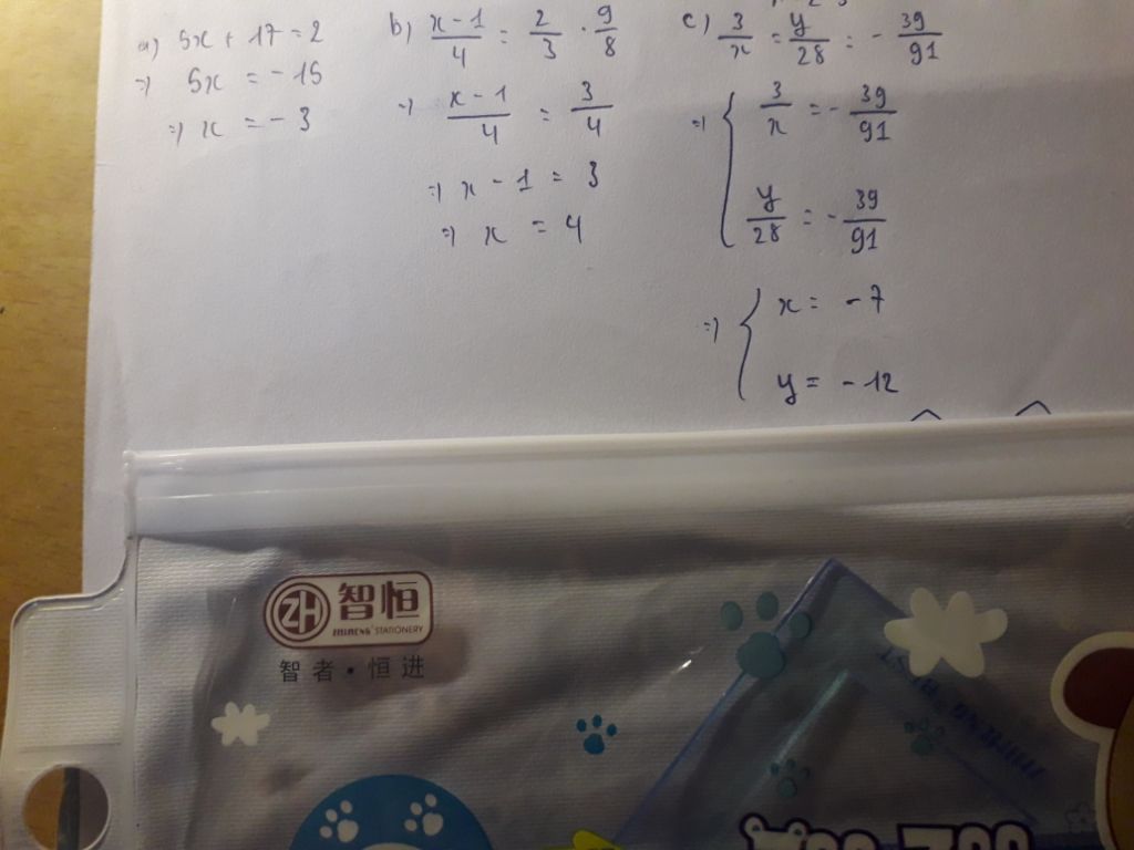 $\begin{cases}\dfrac{3}{x}=\dfrac{-39}{91}\\\dfrac{y}{28}=\dfrac{-39}{91}\end{cases}$