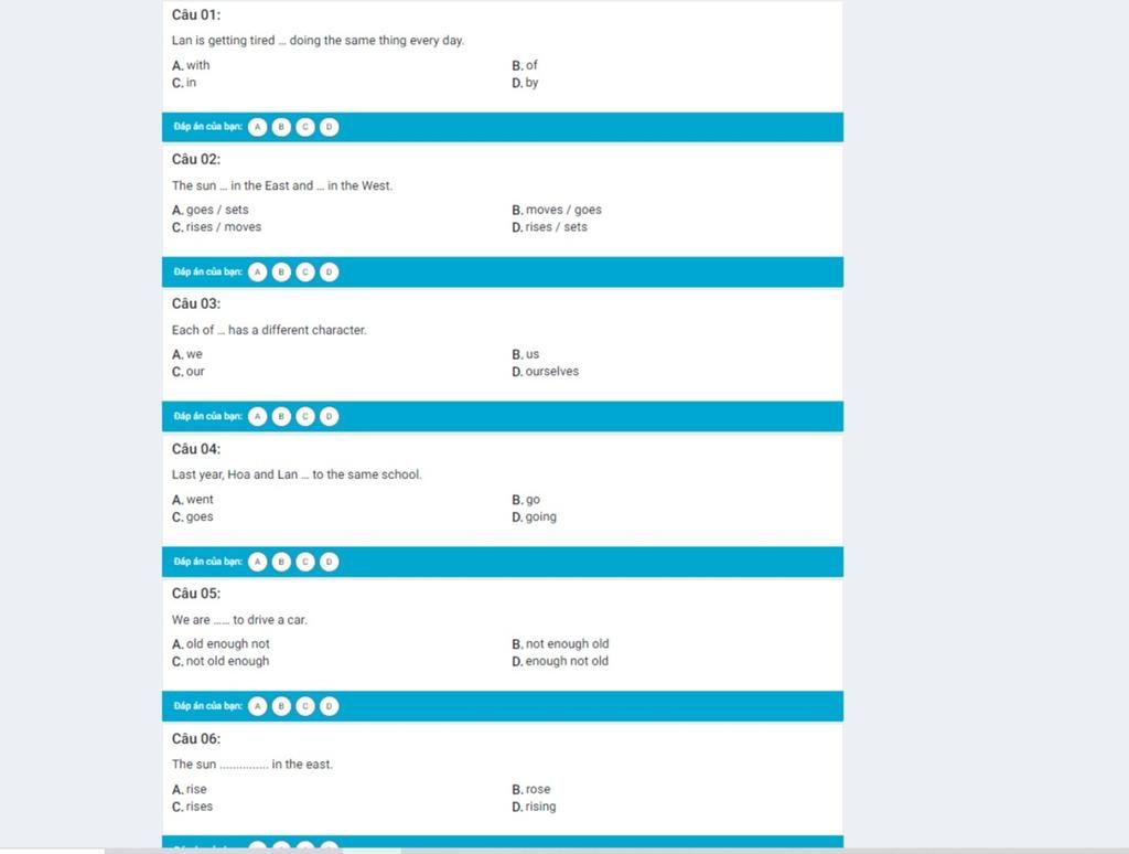 1. B of ( tired of + V-ing : Chán ngán với điều gì, hoạt động nào đó )