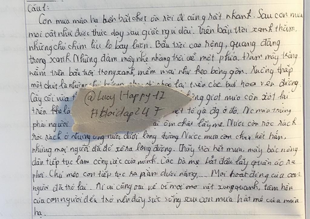 Gió đã nổi lên. Những tán cây đu đưa theo gió. Những chiếc lá bên đường bay tứ tung. Lộp độp...lộp độp... Những hạt mưa bắt đầu rơi xuống. Một lúc sau, mưa ào ào đổ xuống. Mọi người đều chạy đi trú mưa. Các con vật cũng cuống quýt đi tìm chỗ trốn. Những chiếc lá vẫy tai run rẩy. Những chiếc xe chạy vội làm nước bắn tung tóe. Từ trong nhà nhìn ra chỉ thấy một màn nước trắng xóa. Mưa rơi lộp độp trên sân gạch.