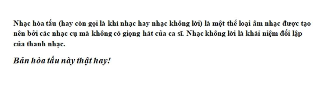hòa tấu là : (nhạc hoà tấu ) một thể loại âm nhạc được tạo nên bởi các nhạc cụ mà không có giọng hát của ca sĩ .nhạc không lời là khái niệm của thanh nhạc.