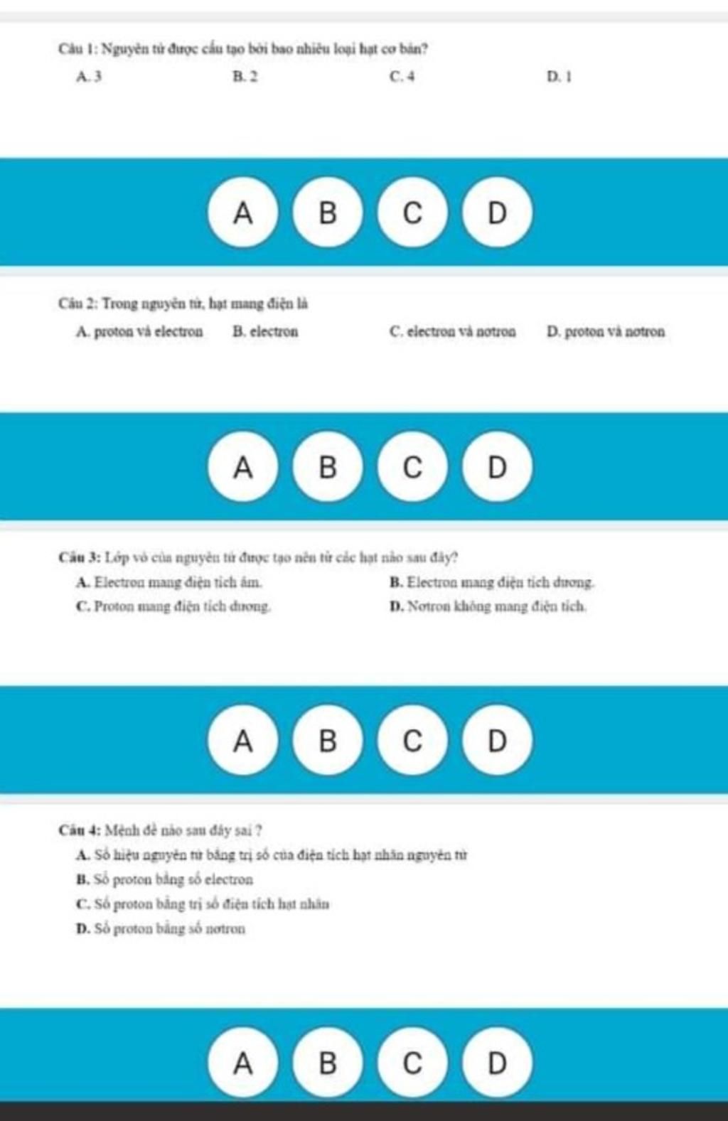 Trong nguyên tử số hạt proton bằng số hạt electron và số điện tích hạt nhân bằng số proton