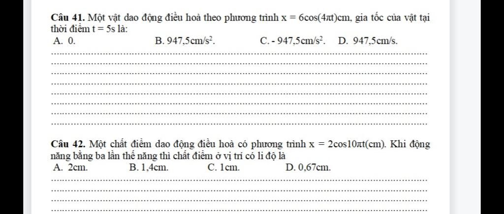 Câu 41. Một vật dao động điều hoà theo phương trình x = 6cos(4nt)cm, gia tốc của vật tại