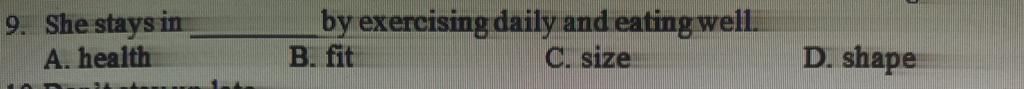 → Ta có cụm từ stay in shape/ keep in shape mang nghĩa là giữ cho cơ thể tránh tăng cân, cân đối. Đề cập đến việc tập thể dục thường xuyên (exercising daily) cũng như là ăn uống hợp lí, tránh những đồ uống có cồn (eating well)