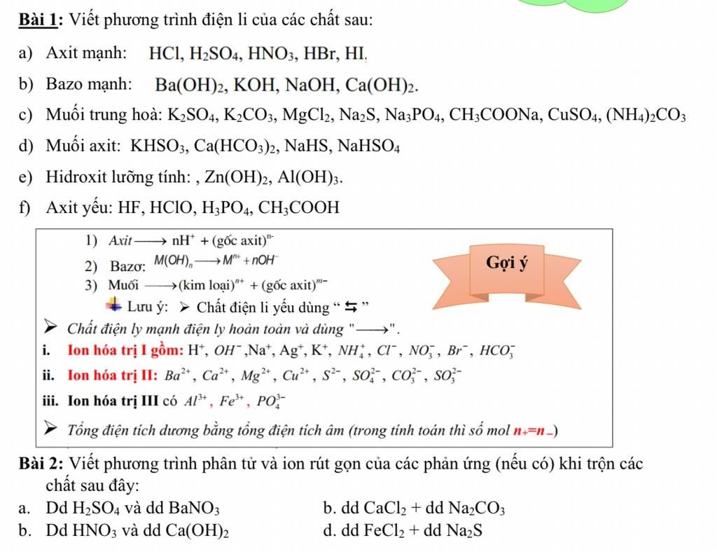 Bài 1: Viết phương trình điện li của các chất sau: