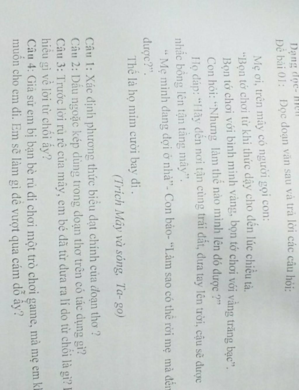 Đề bải 01: Đọc doan văn sau và trả lời các câu hỏi: