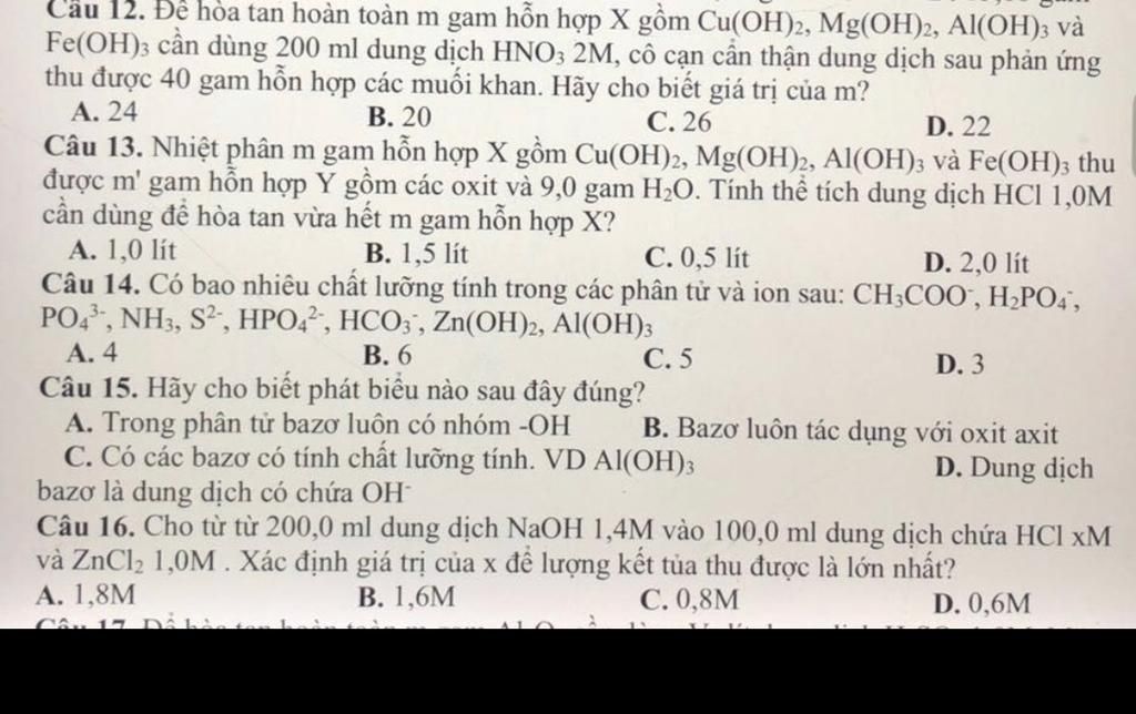 Cầu 12. Để hòa tan hoàn toàn m gam hồn hợp X gồm Cu(OH)2, Mg(OH)2, Al(OH); và