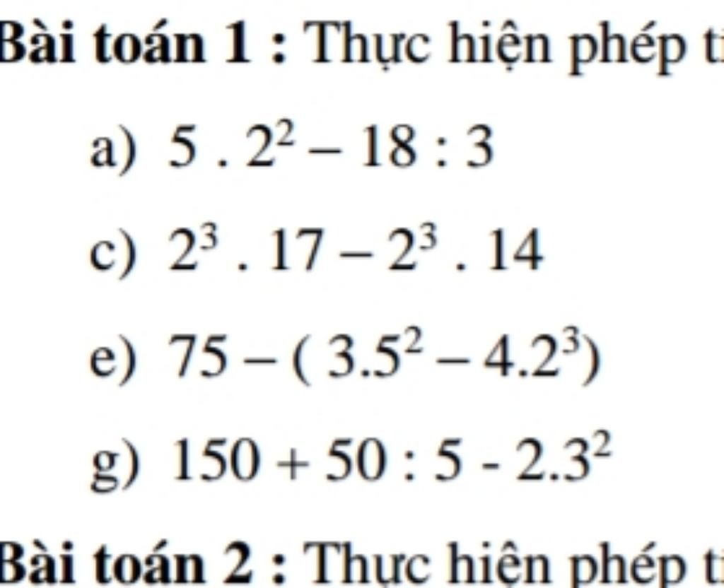 `g) 150 + 50 : 5 - 2 . 3^2`