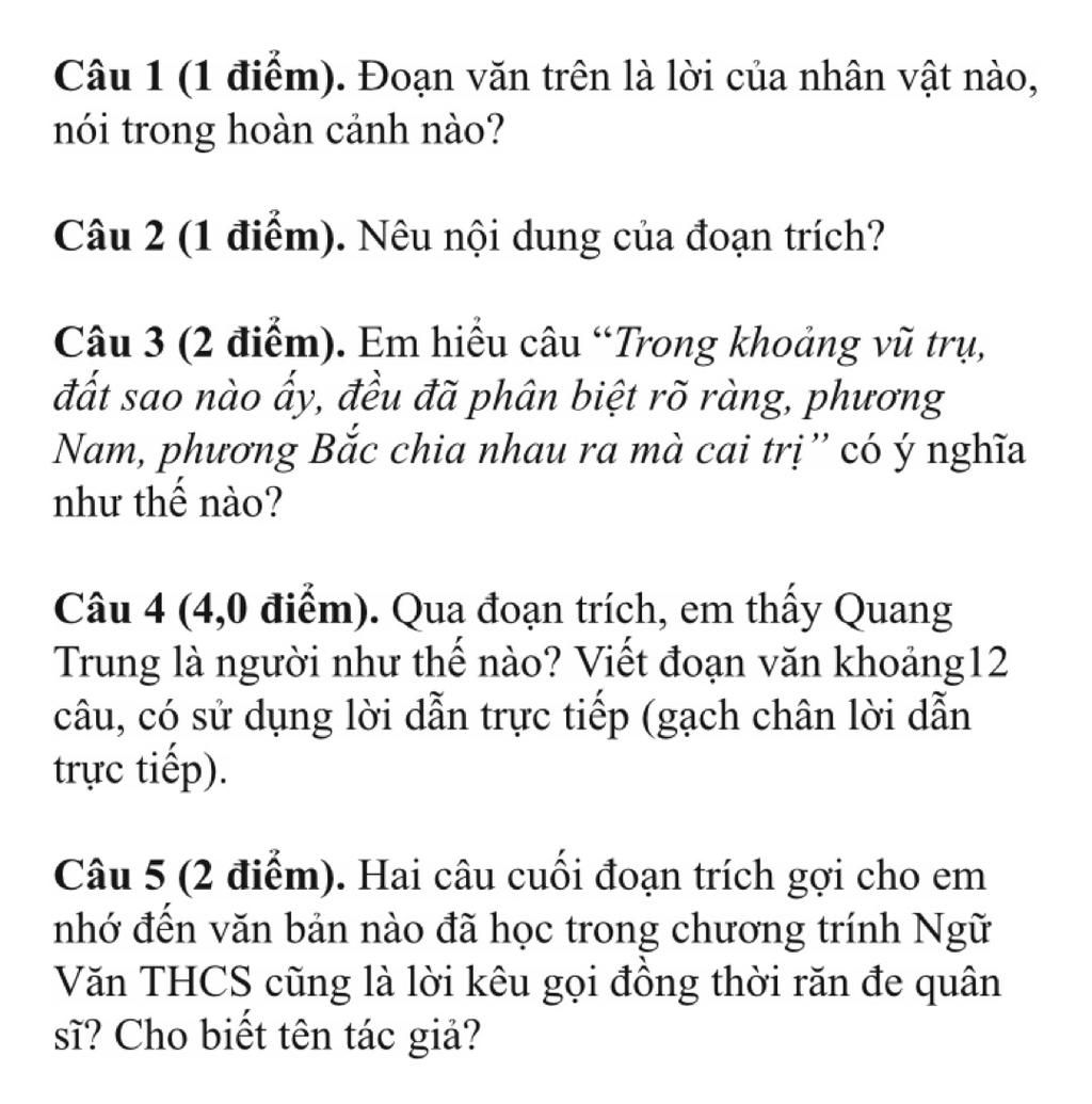 1. Đoạn văn trên là lời của nhân vật Nguyễn Huệ (hay vua Quang Trung đều được nha). Nói trong hoàn cảnh Quân Thanh sang xâm lấn nước ta, hiện ở Thăng Long, nước ta đang lâm nguy, 2. Nội dung: Nguyễn Huệ đang lên tiếng vạch trần tội ác của giặc, đồng thời nêu cao những tấm gương anh hùng xưa đã hi sinh, anh dũng chiến đấu đến hơi thở cuối cùng trên chiến trường làm tăng nhuệ khí của binh lính.
