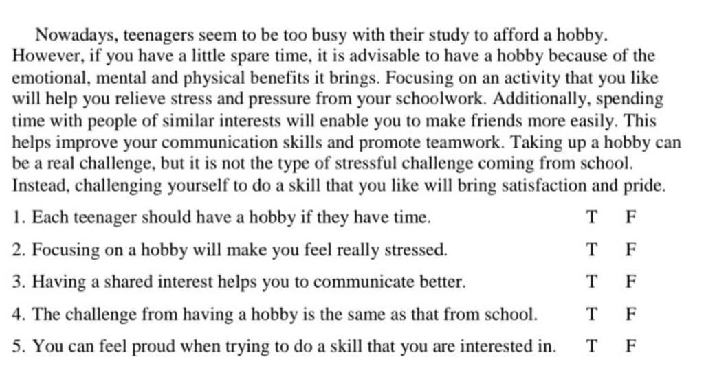 4.F ( Vì đề bài có đề cập câu " Taking up a hobby can be ... coming from school " )