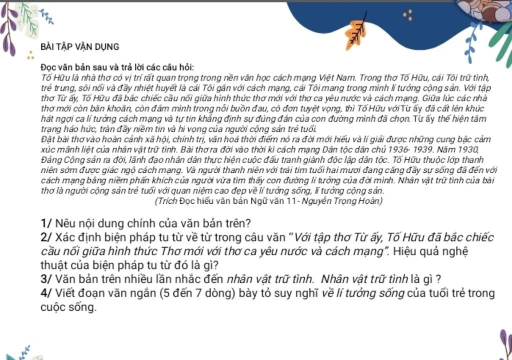 Câu 3 : nhân vật trữ tình là con người của tác giả - nhà thơ hiện ra từ trong văn bản của kết cấu trữ tình để bộc những suy nghĩ tâm tư của mình