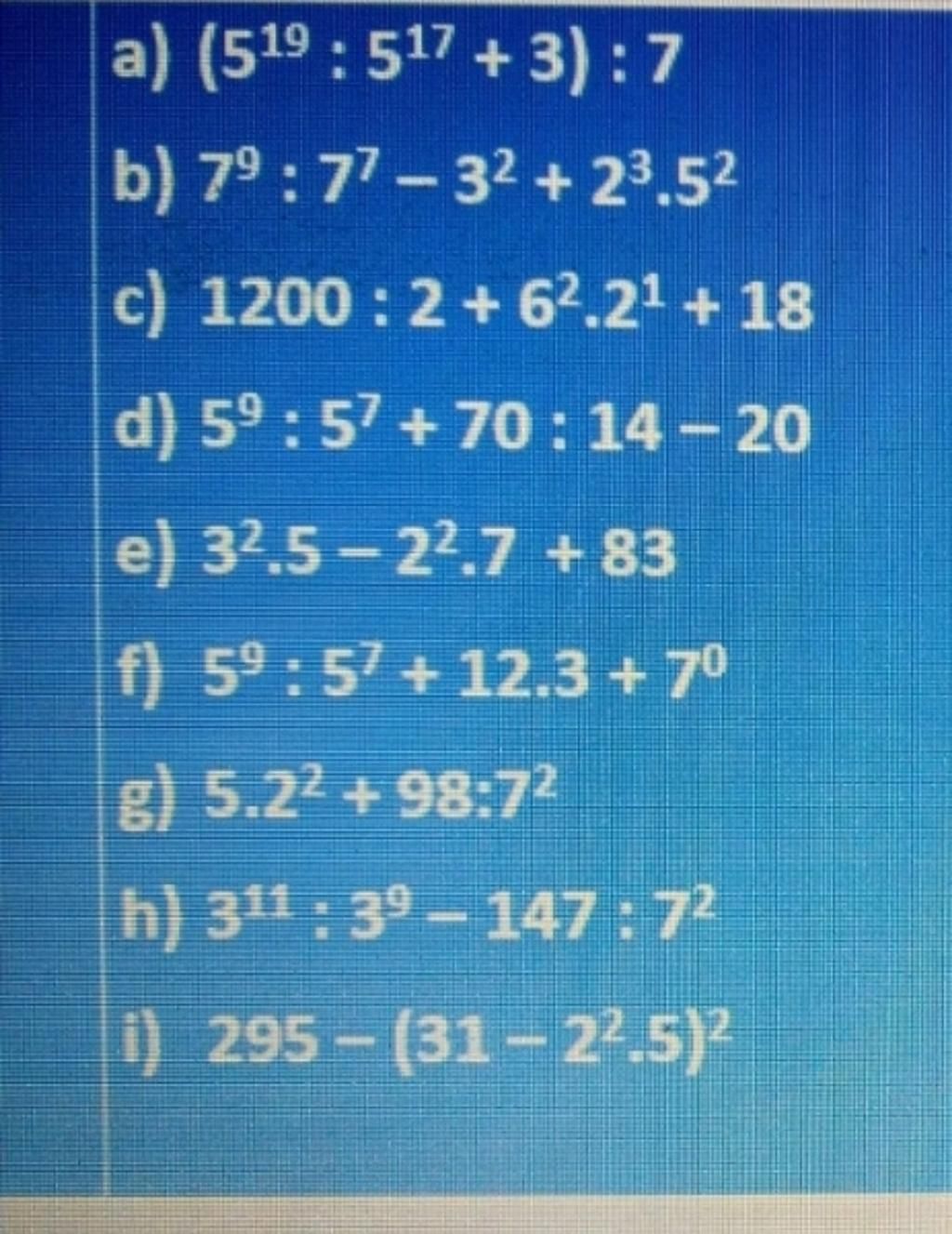 `a) (5^19:5^17+3):7 = (5^2+3):7=(25+3) :7=28:7=4`$\\$ `b)7^9:7^7-3^2 + 2^3 . 5^2 = 7^2-9+8.25=49-9+200=40+200=240`$\\$ `c)1200:2+6^2 . 2^1+18 = 600+36.2+18 =600+72+18=690`$\\$ `d)5^9:5^7+70:14-20 =5^2+5-20 =25+5-20=30-20=10`$\\$ `e)3^2.5-2^2.7+83 =9.5-4.7+83=45-21+83=24+83=107`$\\$ `f)5^9:5^7+12.3+7^0 = 5^2+36+1=25+36+1=62`$\\$ `g)5.2^2+98:7^2=5.4+98:49=20+2=22`$\\$ `h)3^11:3^9-147:7^2=3^2-147:7^2=9-147:49=9-3=6`$\\$ `i)295-(31-2^2.5)^2 =295-(31-4.5)^2=295-(31-20)^2`$\\$ `=295-11^2=295-121=174`$\\$
