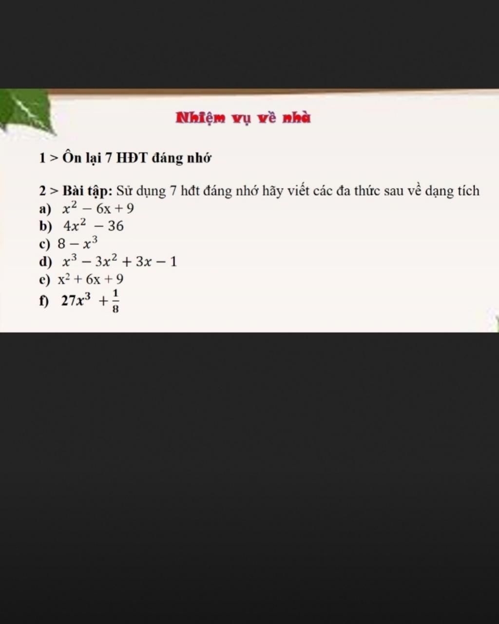 e, x^2+6x+9=(x+3)^2 | f, 27x^3 + 1/8 =(3x + 1/2)(9x^2 + 3/2 x + 1/4)
