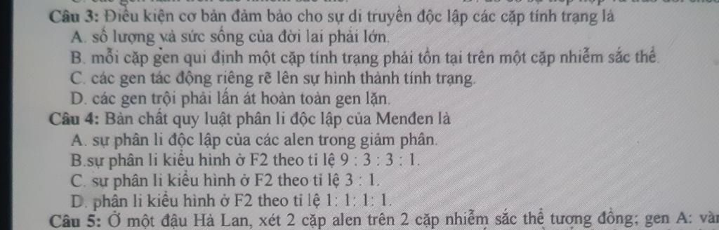 Bản chất quy luật phân li độc lập của Menđen là sự phân li kiểu hình ở F2 theo tỉ lệ 3:1.