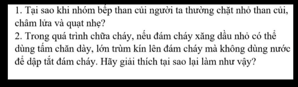 1.chặt nhỏ củi để củi cháy tốt và dễ cháy hơn quạt nhẹ để lửa cháy to hơn vì khi lửa gặp oxy càng mạnh hơn tỏa nhiệt nhiều hơn.