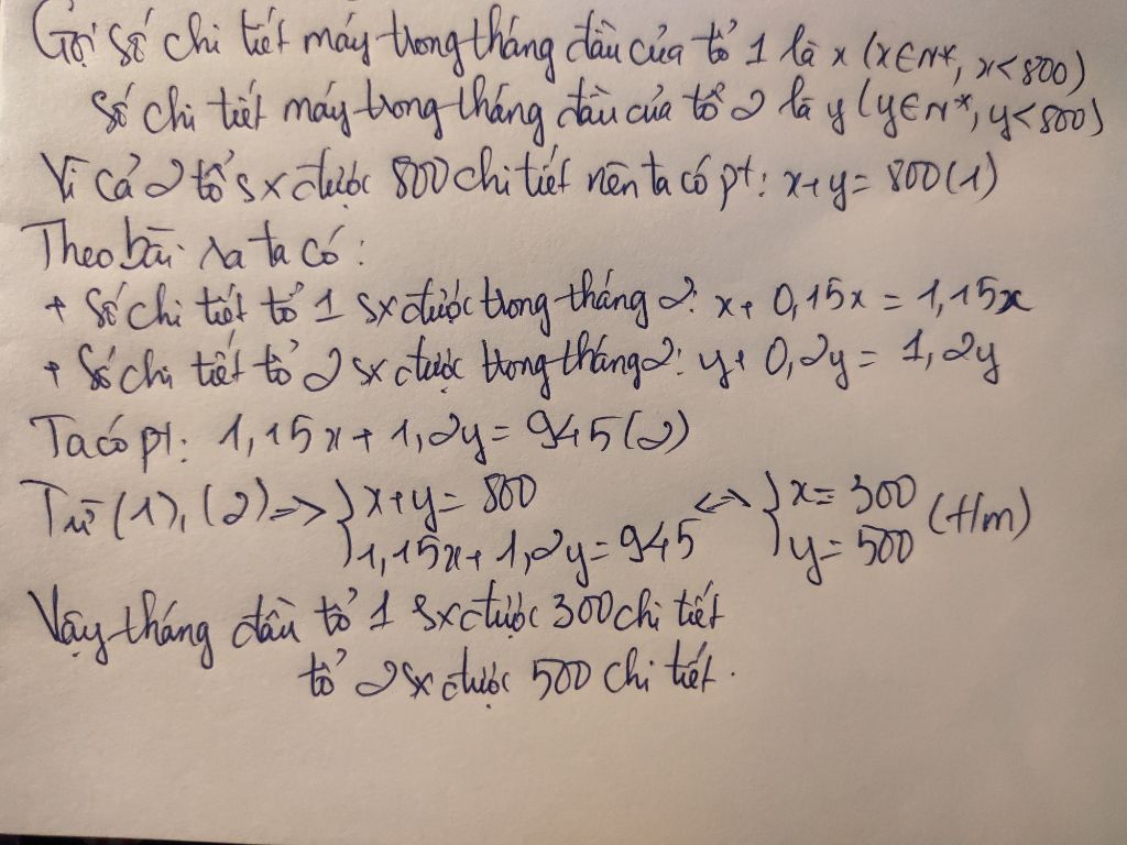Vậy số chi tiết máy tổ 1 làm được trong tháng đầu là 300 chi tiết máy và số chi tiết máy tổ 2 làm được trong tháng đầu là 500 chi tiết máy