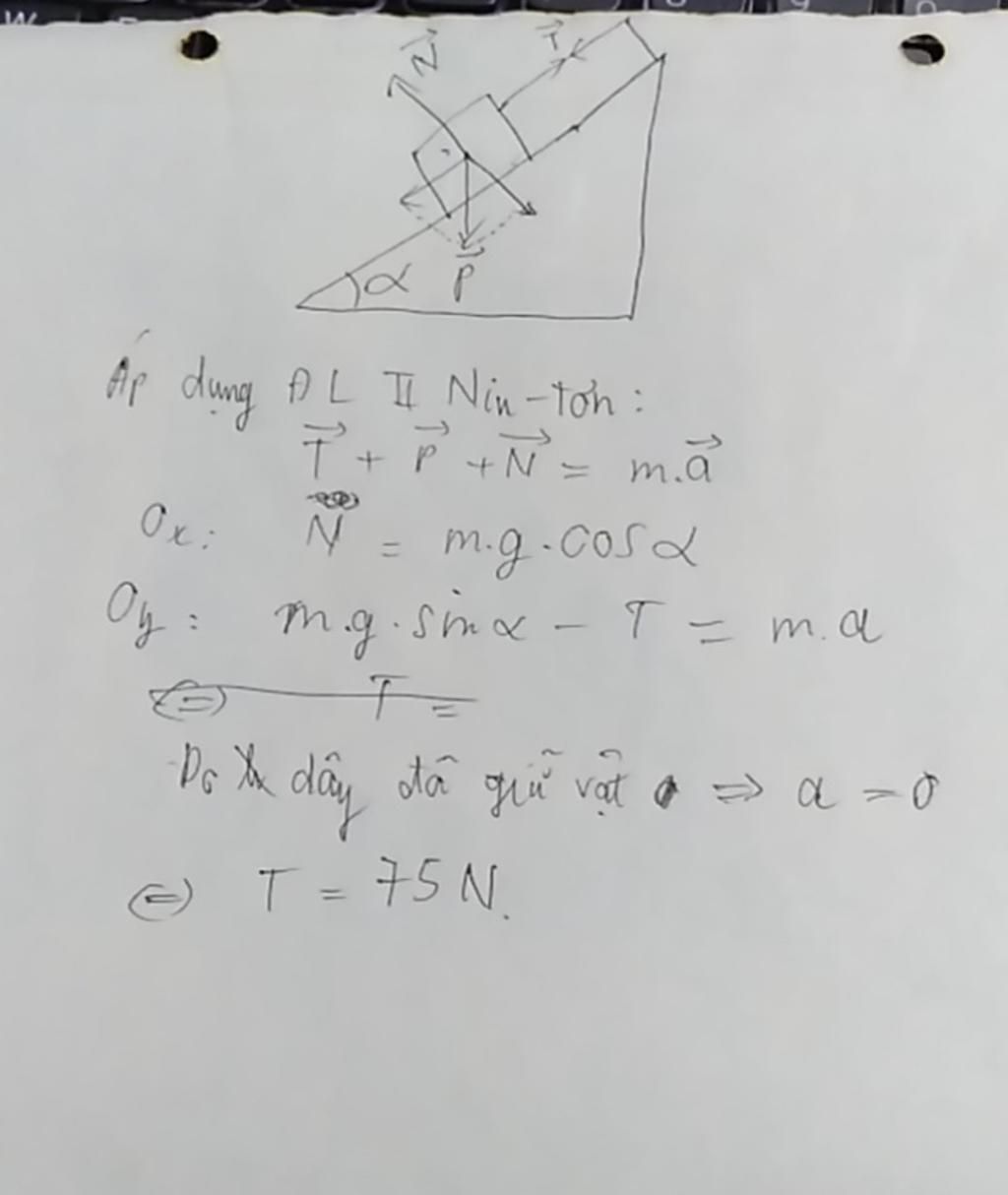 \(N = P\cos \alpha = mg\cos 30 = 15.10.\dfrac{{\sqrt 3 }}{2} = 75\sqrt 3 N\)