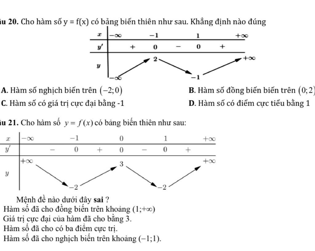 Câu 20. Cho hàm số y = f(x) có bảng biến thiên như sau. Khẳng định nào đúng
