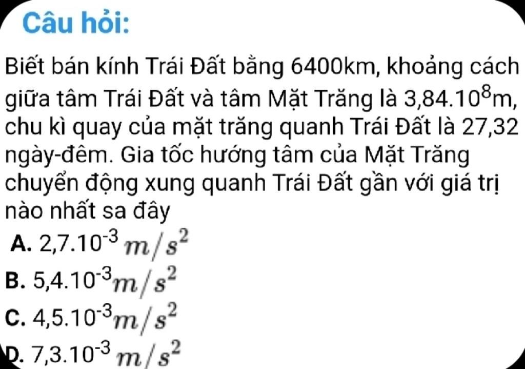 Gia tốc hướng tâm của Mặt Trăng là: