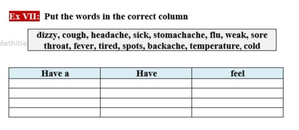 dizzy, cough, headache, sick, stomachache, flu, weak, sore