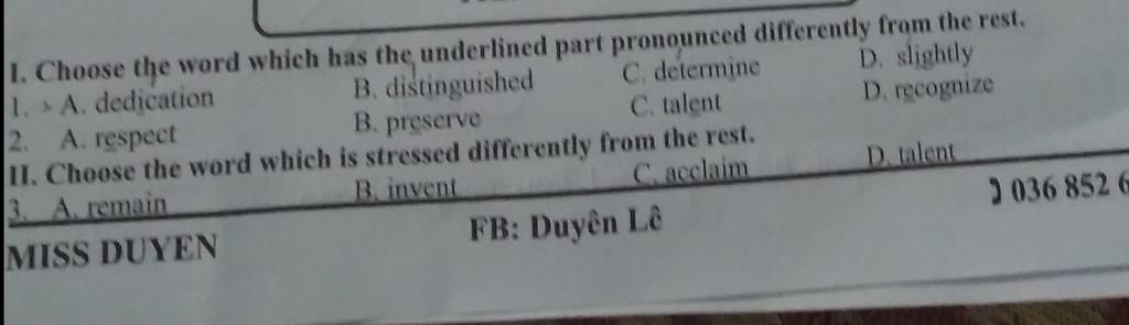 I. Choose the word which has the underlined part that is pronounced differently from the rest