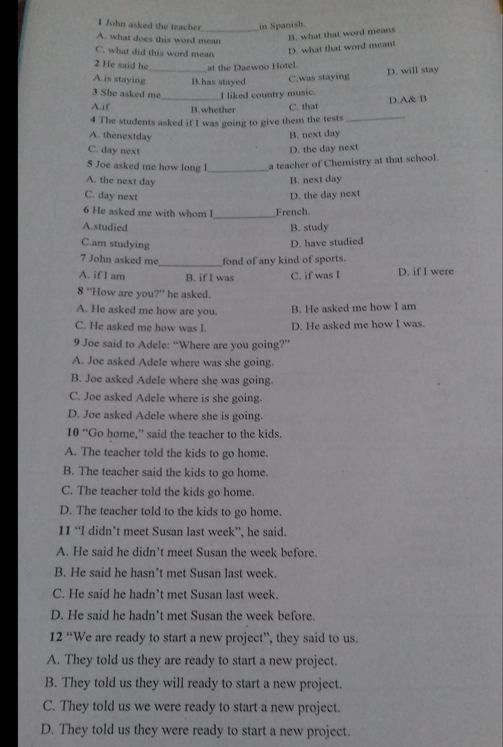 12. D ( lùi thì HTĐ → QKĐ: are → were/was vì là they nên → were, đổi we → they )