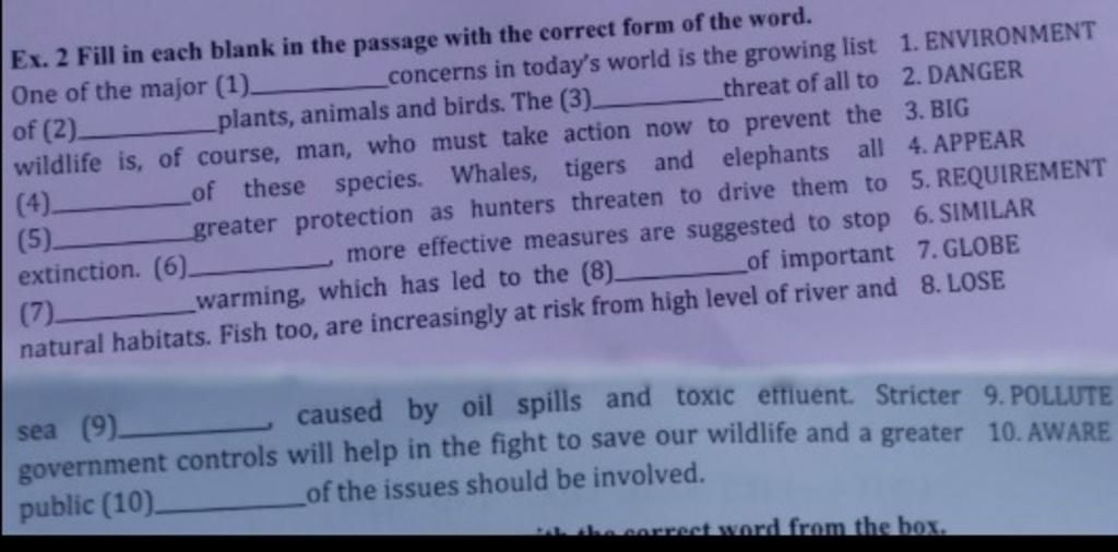 One of the major (1) environmental concerns in today's world is growing list of (2) endangered plants, animals and birds. The (3) biggest threat of all wildlife is, of course, man, who must take action now to prevent the (4) disappearance of these species. Whales, tigers and elephants all (5) require greater protection as hunters threaten to drive them to extinction, (6) Similarly, more effective measures are suggeted to stop (7) global warming, which has led to the (8) loss of important natural habitats. Fish too, are increasingly at risk frpm high lever of the river and sea (9) pollution , cause by oil spill and toxic effluent. Stricter government controls will help in the fight to save our wildlife and a greater public (10) awareness of the issuses should be involved.