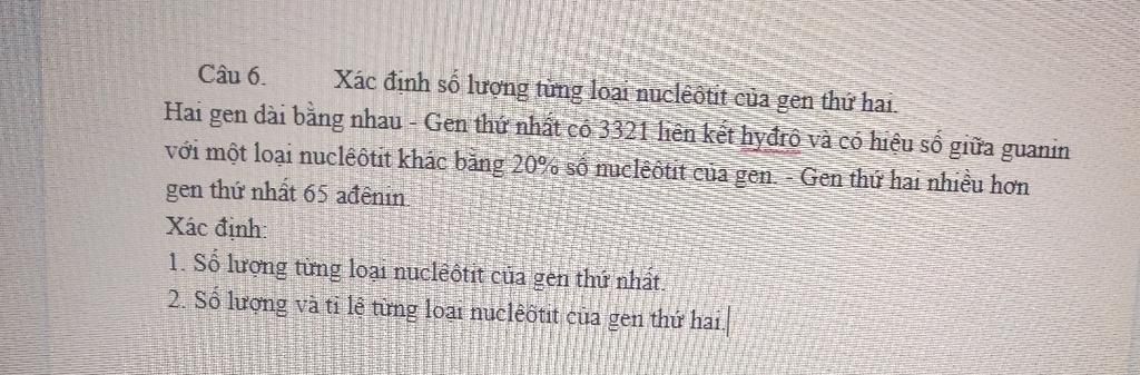 b. gen thứ 2 nhiều hơn gen thứ nhất 65 ađênin => ít hơn gen thứ nhất 65 guanin