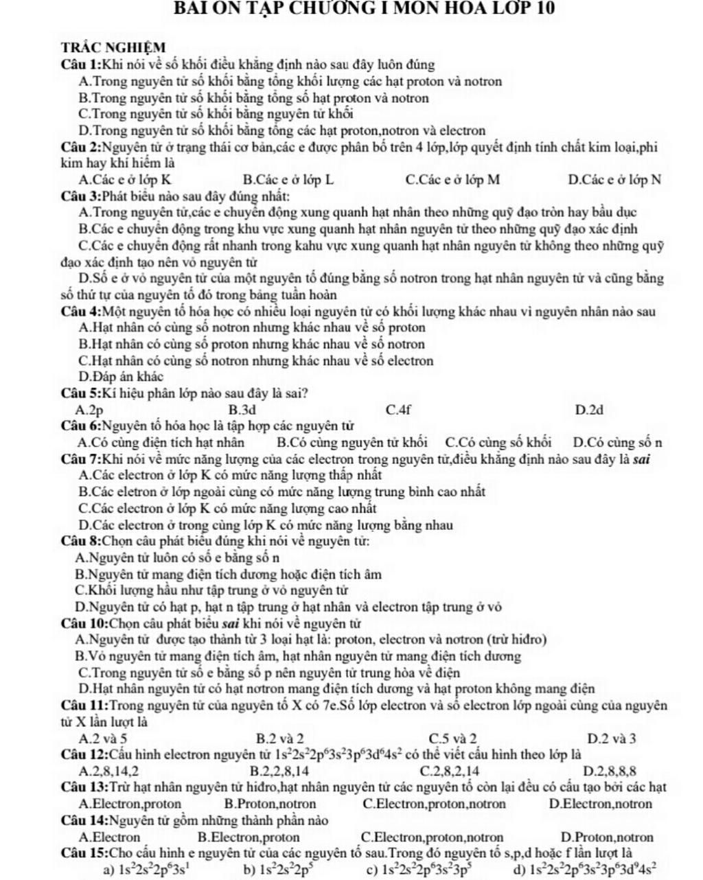 BÀI ÔN TẠP CHƯƠNG I MON HOA LỚP 10