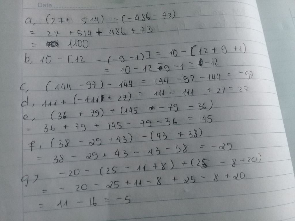 Đáp án:a)1100, b)-12, c)-97, d)27, e)145, f)-29, g)-5