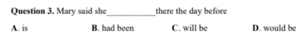 B.had been - Structure: S+said+S2/O+(that)+S+V(lùi thì)+.... "the day before" => Câu ban đầu ở thì QKĐ (ago) => Lùi về qkht: S+ had P2