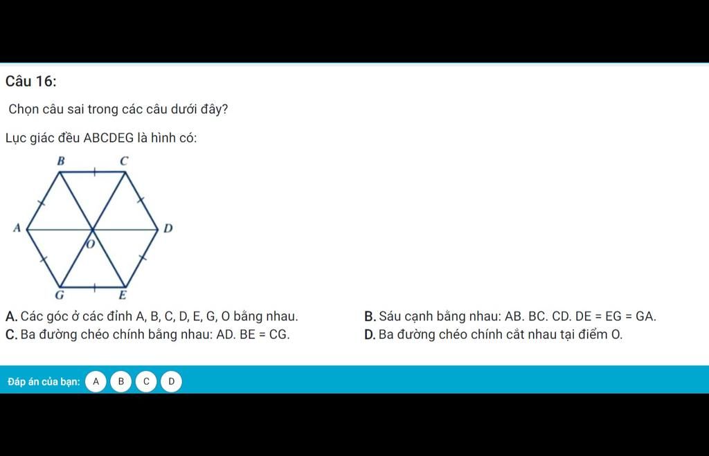 Đáp án: A.Các góc ở các đỉnh A,B,C,D,E,G,O bằng nhau