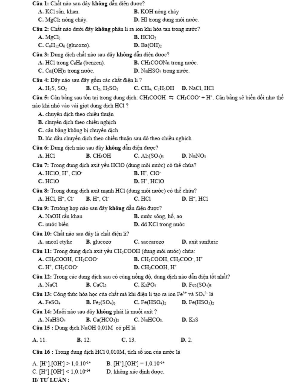 Câu 2: Chất nào đưới đây không phân li ra ion khi hòa tan trong nước?