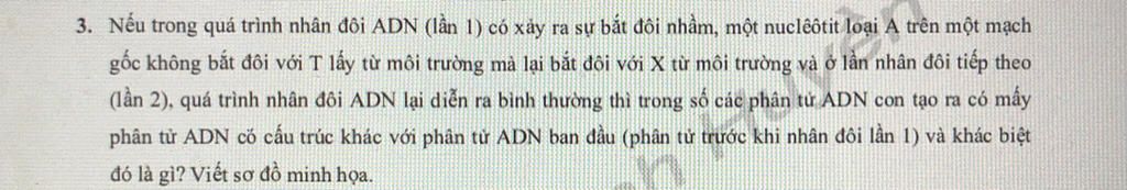 3. Nếu trong quá trình nhân đôi ADN (lần 1) có xảy ra sự bắt đôi nhầm, một nuclêôtit loại A trên một mạch