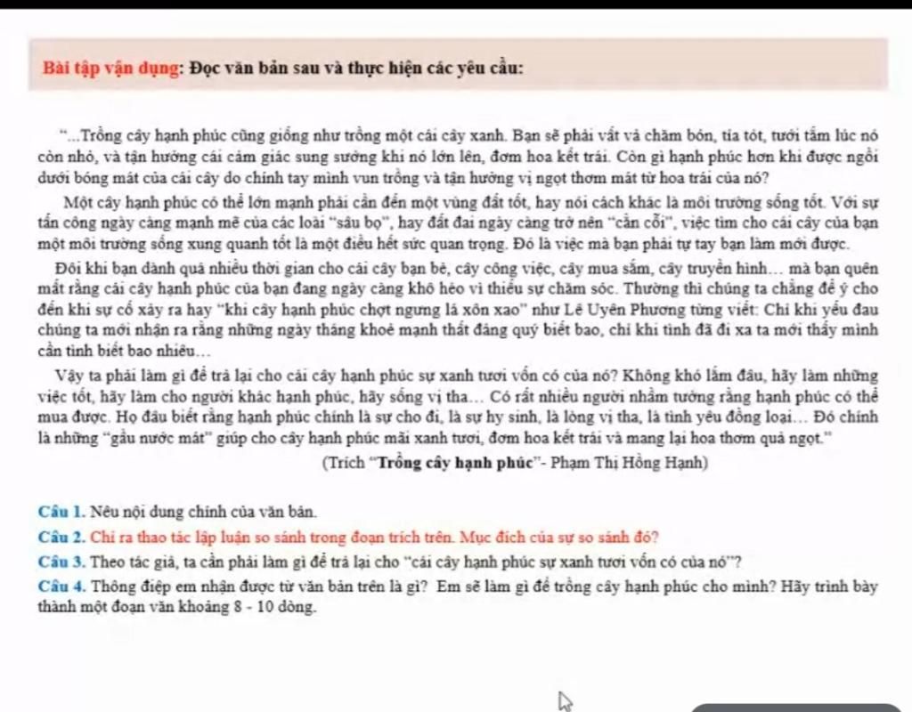 so sánh ở đoạn văn trên là ở câu : "Trồng cây hạnh phúc cũng giống như trồng một cái cây xanh " .Tác dụng của việc so sánh : giúp người đọc hình dung được việc vun trồng nên "một cây hạnh phúc" nó giống vs việc chúng ta trồng cây xanh .Một cây xanh muốn tươi tốt ,xanh mát phải tốn rất nhiều công sức của người trồng và đòi hỏi ở nhiều yếu tố .....Từ vc so sánh này làm nổi bật hơn ý nghĩa của câu văn mà tác giả muốn truyền đạt ,"trồng cây hạnh phúc " là cần những gì ,ảnh hưởng của các yếu tố khác như thế nào ...Chung quy lại so sánh câu văn trên trở nên gợi hình ,gợi cảm giúp người đọc liên tưởng đến những tâm ý mà tác giả nhắn gửi.