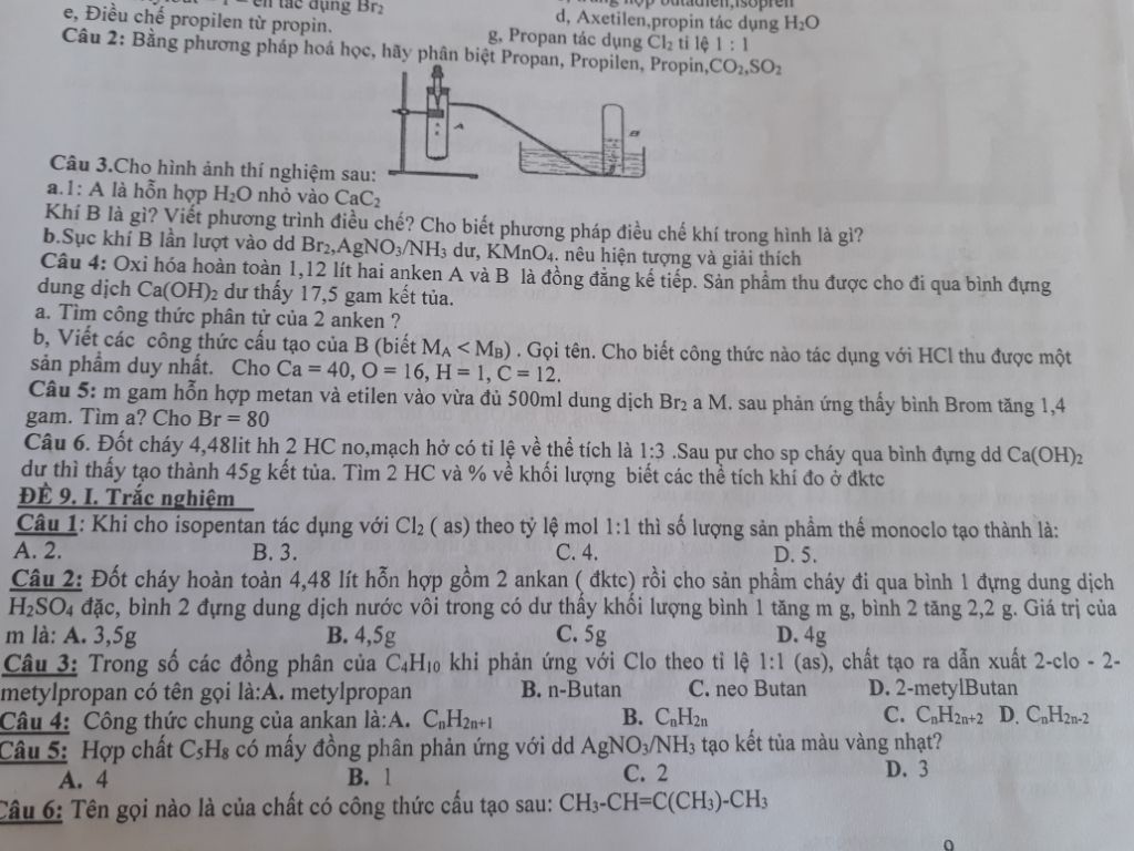 Câu 2: Bằng phương pháp hoá học, hãy phân biệt Propan, Propilen, Propin,CO2,SO2
