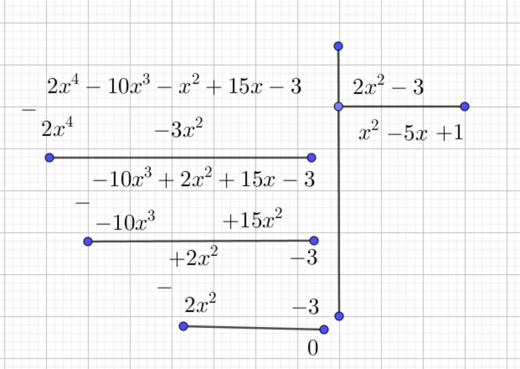 `\begin{array}{c|c} \quad \quad \quad 2x^4-10x^3-x^2+15x-3&2x^2-3\\\hline 2x^4-3x^2&x^2-5x+1\\\text{_____________________}\\\quad \quad -10x^3+2x^2+15x-3\\-10x^3+15x\\\text{_____________________}\\2x^2-3 \\2x^2-3\\\text{_____________________}\\0\\\end{array}`