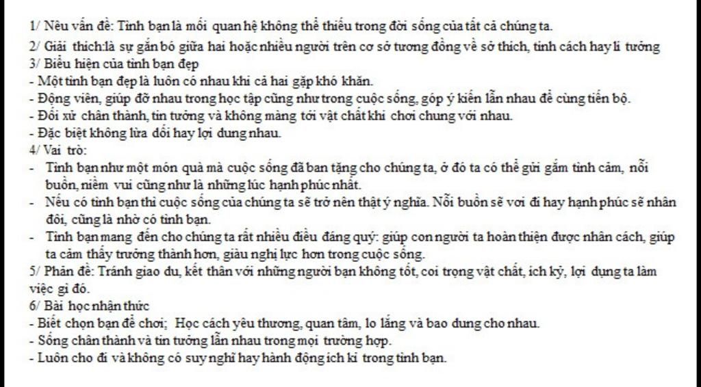 Trong cuộc sống của mỗi con người nói riêng và mọi người nói chung thì tình bạn có vai trò hết sức quan trọng,bạn là người tri âm tri kỉ nâng đỡ ta dìu dắt ta trong cuộc sống muôn vàn những khó khăn chông gai trắc trở.Con người ta chung sống với nhau bằng cái tình,trong tình cảm lớn ấy tình bạn cũng là một tình cảm quan trọng nó có vai trò đến đời sống vật chất cũng như tinh thần của con người. Mỗi người chúng ta sống trên đời nên có ít nhất một người bạn.Cuộc sống là muôn vàn những khó khăn trắc trở,không ai có thể biết trước được điều gì đang chờ đợi ta trước mắt.Có muôn vàn những con đường để ta chọn trên thế giới này,có những nẻo đường đầy trông gai nhưng cũng có những con đường trải đầy hoa hồng nhùn lụa và phía trước con đường là ánh hào quang rực rỡ.Tất cả những gì ta cần chính là một người bạn để cùng nhau bước cùng nhau chia sẻ buồn vui. Có tình bạn có nghĩa là chúng ta có một người để chia sẻ những tâm tư tình cẩm của mình.Người ta nói tình bạn thời áo trăng là tình bạn đẹp nhất mãi mãi cho đến về sau bạn không thể tìm được tình bạn nào ở độ tuổi trưởng thành sự ngây ngô,hồn nhiên của thời áo trắng nữa.Cùng giúp đỡ nhau trong học tập,vươn lên chính bản thân mình.Một tình bạn đẹp là hai người biết cùng nhau san sẻ vui buồn giúp đỡ nhau những lúc khó khăn để cùng nhau vượt qua chỉ có vậy tình bạn mới thực sự tồn tại và đẹp.
