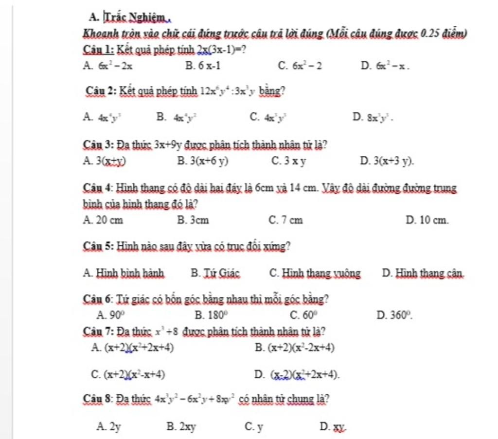 Khoanh tròn vào chž cái đứng trước câu trā lời đúng (Mỗi câu đúng được 0.25 điểm)