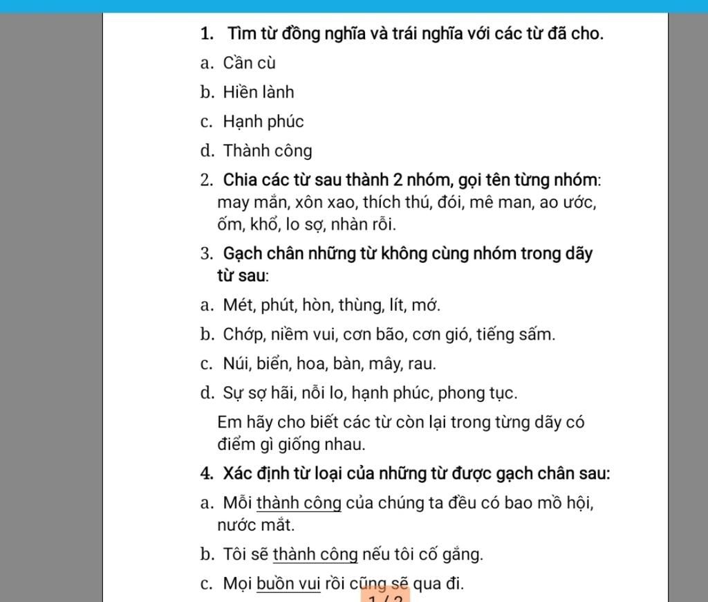 2:may mắn, xôn xao, thích thú, đói, mê man, ao ước, ốm, khổ, lo sợ, nhàn rỗi.